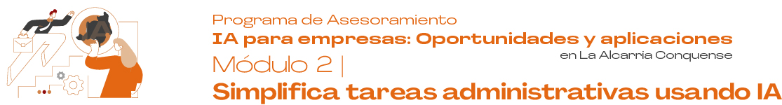 Inicio 5 Programa de Asesoramiento 4 5 Módulo 2: Simplifica tareas administrativas usando IA Volver atrás Módulo 2 Recursos del Módulo Contenido teórico Acceder Podcast Acceder Ejercicio práctico Acceder Lecturas complementarias PCómo Aplicar la IA en tus Tareas Administrativas P8 Procesos que se Pueden Automatizar con IA PImpulsa tu departamento de administración con IA: aumenta eficiencia y reduce costos PLa IA y el futuro del trabajo: tendencias y estadísticas Vídeos complementarios PCómo usar ChatGPT para redactar: Correos y solicitudes - Curso de ChatGPT P¿Qué es la inteligencia artificial? PConvierte Excel en una Herramienta de IA con ChatGPT